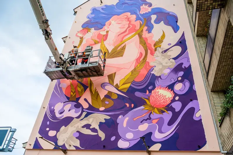 Spanning over twenty meters, the mural incorporates air-purifying colors to enhance both its visual and environmental impact.